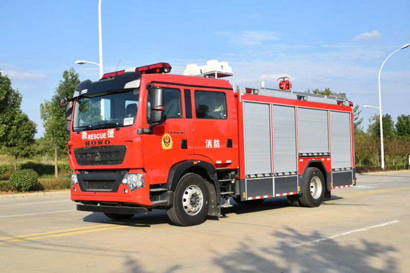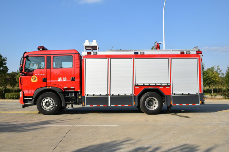 我公司生產(chǎn)的T5G單橋城市主戰(zhàn)消防車采用中國(guó)重汽集團(tuán)濟(jì)南卡車股份有限公司生產(chǎn)的ZZ5207TXFV471GF5型二類汽車底盤, 該車原裝雙排駕駛室,可載含駕駛員在內(nèi)的乘員6人,駕乘舒適輕便。該車采用DC-CAFS60/45M型集成壓縮空氣泡沫滅火系統(tǒng),該壓縮空氣泡沫系統(tǒng)操控簡(jiǎn)易,泡沫生成實(shí)現(xiàn)即時(shí)全自動(dòng)微機(jī)精確調(diào)控,并設(shè)多重保護(hù)與報(bào)警系統(tǒng),消防作戰(zhàn)員可依據(jù)復(fù)雜的火場(chǎng)情況,方便地借助按鈕選擇干泡沫、濕泡沫等不同類型的泡沫滅火方式。該套系統(tǒng)不僅裝有A類泡沫原液,還裝有B類泡沫原液,可高效率地?fù)錅绾涂刂艫、B類物質(zhì)火災(zāi),并具備良好的環(huán)保性能。另外該車配置有牽引電動(dòng)絞盤,7.6米氣動(dòng)升降舉升4*1000w照明燈和10.5kw車載發(fā)電機(jī),使得該車還可獨(dú)立開展偵查、破拆、救生、照明、防護(hù)等綜合搶險(xiǎn)救援功能。
